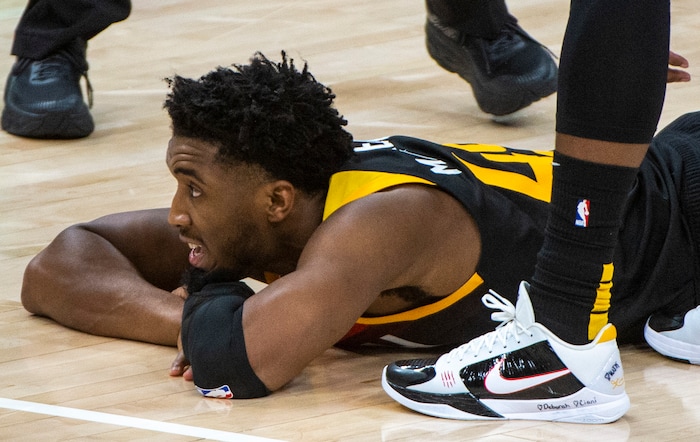 (Rick Egan | The Salt Lake Tribune) Utah Jazz guard Donovan Mitchell (45) lies the floor after being called for a personal foul, in NBA action between the Utah Jazz and the Philadelphia 76ers at Vivint Arena, on Monday, Feb. 15, 2021.
