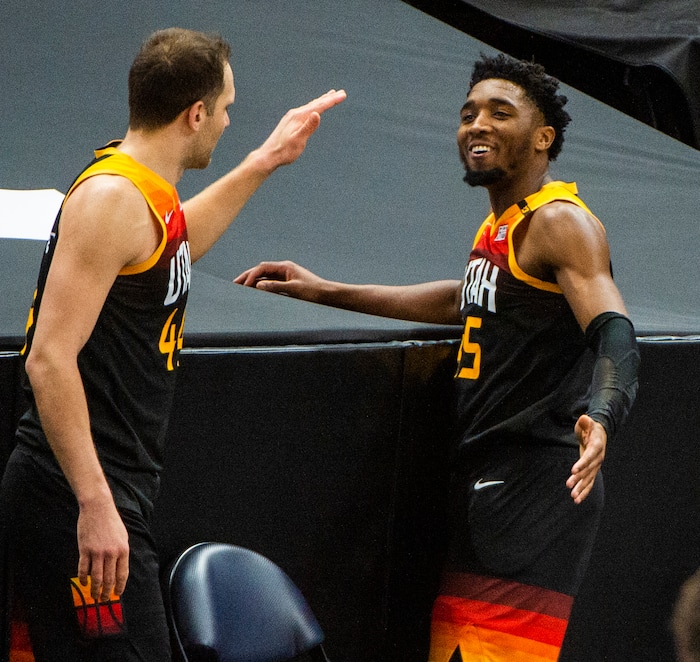 (Rick Egan | The Salt Lake Tribune) Utah Jazz forward Bojan Bogdanovic (44) and Utah Jazz guard Donovan Mitchell (45) shares a laugh as they both chase a ball out of bounds, in NBA action between the Utah Jazz and the Philadelphia 76ers at Vivint Arena, on Monday, Feb. 15, 2021.