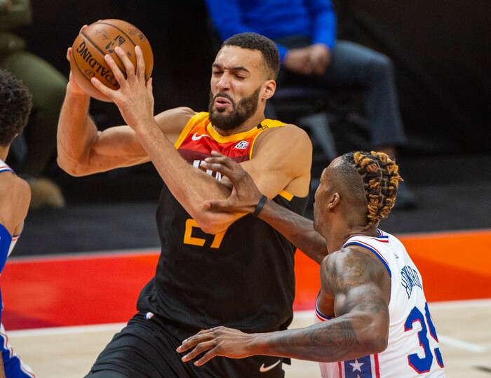 (Rick Egan | The Salt Lake Tribune) Utah Jazz center Rudy Gobert (27) is fouled by Philadelphia 76ers center Dwight Howard (39), in NBA action between the Utah Jazz and the Philadelphia 76ers at Vivint Arena, on Monday, Feb. 15, 2021.