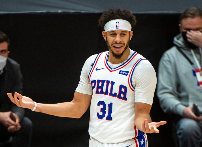 (Rick Egan | The Salt Lake Tribune) Philadelphia 76ers guard Seth Curry (31) complains about a call to the official, in NBA action between the Utah Jazz and the Philadelphia 76ers at Vivint Arena, on Monday, Feb. 15, 2021.