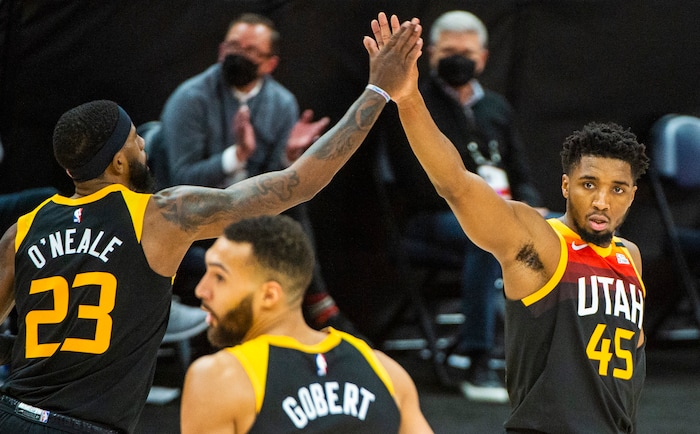 (Rick Egan | The Salt Lake Tribune) Utah Jazz guard Donovan Mitchell (45) \hig-fives Utah Jazz forward Royce O'Neale (23) after he hit another 3-pont-shot, in NBA action between the Utah Jazz and the Philadelphia 76ers at Vivint Arena, on Monday, Feb. 15, 2021.