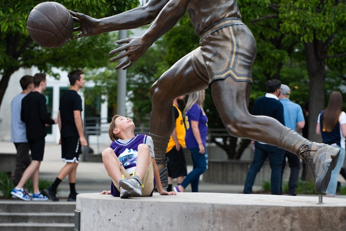 (Briana Scroggins | Special to The Tribune) Cooper Tweet, 9, of Riverton, looks up before he has his photograph taken outside of Vivint Smart Home Arena before the Jazz play the Memphis Grizzlies in Salt Lake City on Wednesday, May 26, 2021. It was Cooper’s birthday and first Jazz game of the season.