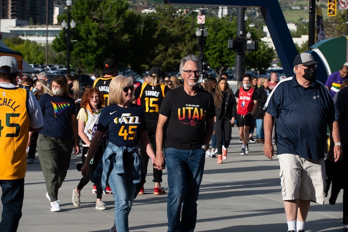 (Briana Scroggins | Special to The Tribune) Rob and Jan Boardman, of Bluffdale, hold hands as they walk towards the entrance of Vivint Smart Home Arena before the Jazz play the Memphis Grizzlies in Salt Lake City on Wednesday, May 26, 2021.