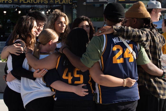 (Briana Scroggins | Special to The Tribune) Members of Millennium Dance Complex SLC huddle up and discuss their intentions tbefore dancing outside of Vivint Smart Home Arena before the Jazz play the Memphis Grizzlies in Salt Lake City on Wednesday, May 26, 2021.