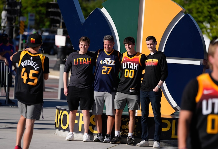 (Francisco Kjolseth | The Salt Lake Tribune) Fans pose for photos before the start of Game 5 against the Memphis Grizzlies of an NBA basketball first-round playoff series Wednesday, June 2, 2021, in Salt Lake City, UT.