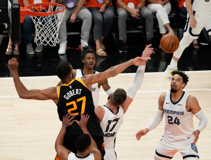 (Francisco Kjolseth | The Salt Lake Tribune) Utah Jazz center Rudy Gobert (27) tries to block Memphis Grizzlies guard Ja Morant (12) in the first half of Game 5 of an NBA basketball first-round playoff series Wednesday, June 2, 2021, in Salt Lake City, UT.