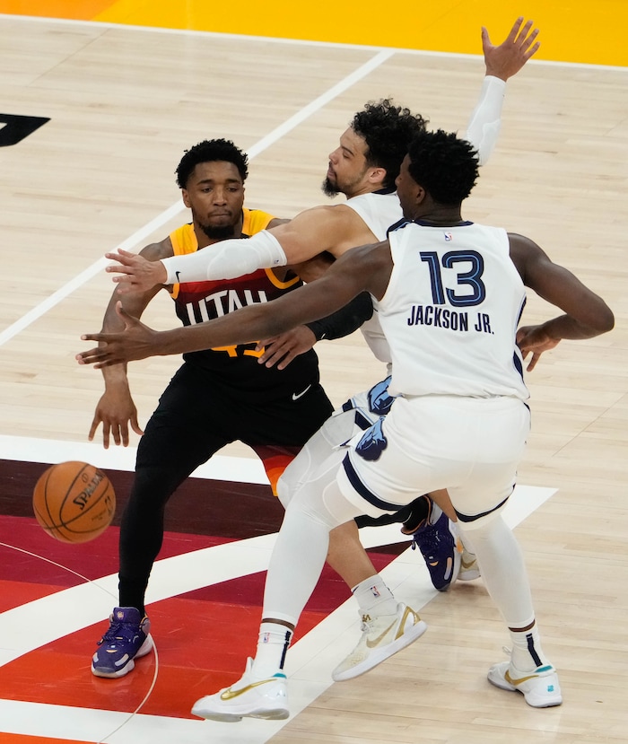 (Francisco Kjolseth | The Salt Lake Tribune) Memphis Grizzlies forward Dillon Brooks (24) and Memphis Grizzlies forward Jaren Jackson Jr. (13) try to double up on Utah Jazz guard Donovan Mitchell (45) in the second half of Game 5 of an NBA basketball first-round playoff series Wednesday, June 2, 2021, in Salt Lake City, UT.