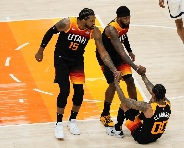 (Francisco Kjolseth | The Salt Lake Tribune) Utah Jazz center Derrick Favors (15) and Utah Jazz forward Royce O'Neale (23) help Utah Jazz guard Jordan Clarkson (00) off the floor in the first half of Game 5 of an NBA basketball first-round playoff series Wednesday, June 2, 2021, in Salt Lake City, UT, against the Memphis Grizzlies.
