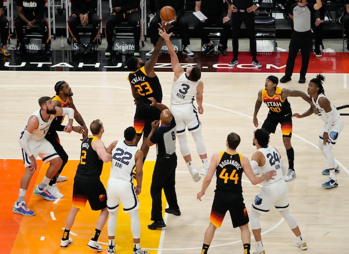 (Francisco Kjolseth | The Salt Lake Tribune) Utah Jazz forward Royce O'Neale (23) goes up for a jump ball against Memphis Grizzlies guard Grayson Allen (3) in the first half of Game 5 of an NBA basketball first-round playoff series Wednesday, June 2, 2021, in Salt Lake City, UT.