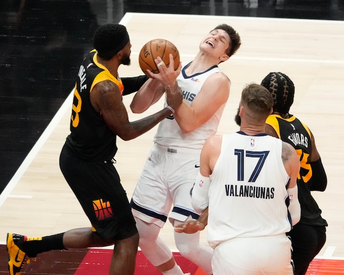 (Francisco Kjolseth | The Salt Lake Tribune) Memphis Grizzlies center Jonas Valanciunas (17) tries to block Utah Jazz forward Bojan Bogdanovic (44) in the first half of Game 5 of an NBA basketball first-round playoff series Wednesday, June 2, 2021, in Salt Lake City, UT.