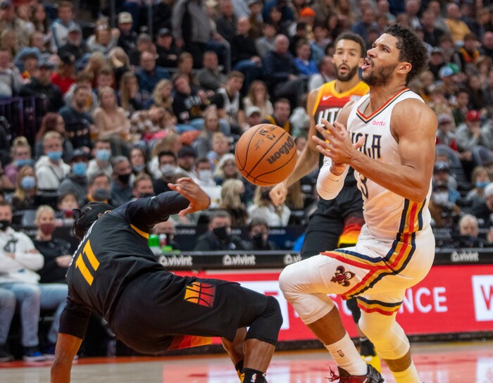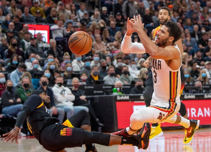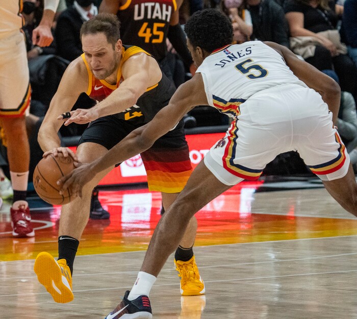 (Rick Egan | The Salt Lake Tribune) New Orleans Pelicans forward Herbert Jones (5) knocks the ball from Utah Jazz forward Bojan Bogdanovic (44), in NBA action between the Utah Jazz and the New Orleans Pelicans, at Vivint Arena, in Salt Lake City, on Friday, Nov. 26, 2021.