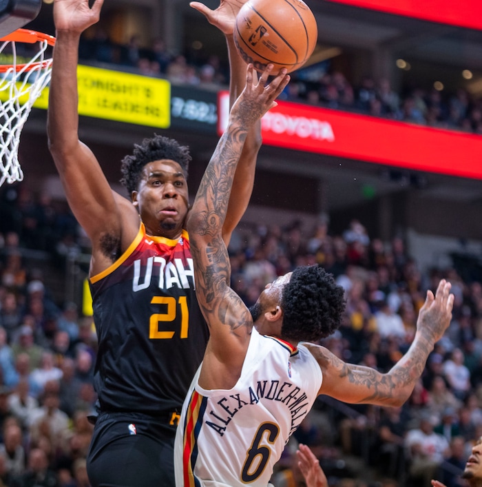 (Rick Egan | The Salt Lake Tribune) New Orleans Pelicans guard Nickeil Alexander-Walker (6) shoots over Utah Jazz center Hassan Whiteside (21), in NBA action between the Utah Jazz and the New Orleans Pelicans, at Vivint Arena, in Salt Lake City, on Friday, Nov. 26, 2021.