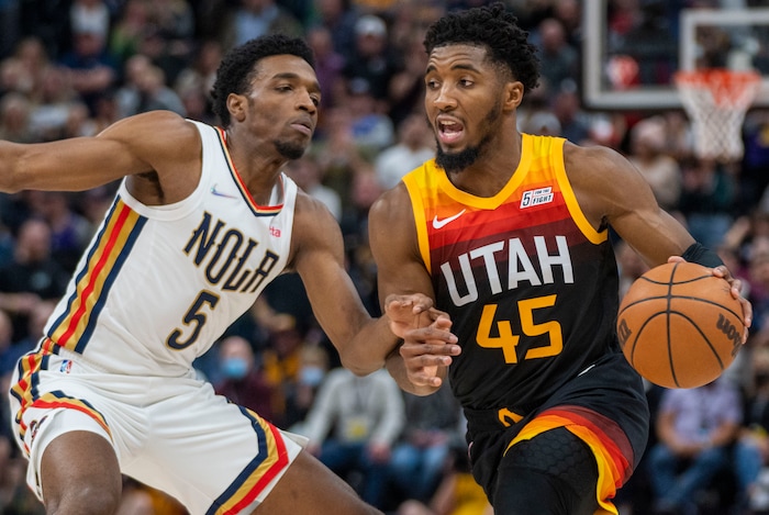 (Rick Egan | The Salt Lake Tribune) Donovan Mitchell (45), takes the ball inside as New Orleans Pelicans forward Herbert Jones (5) defends, in NBA action between the Utah Jazz and the New Orleans Pelicans, at Vivint Arena, in Salt Lake City, on Friday, Nov. 26, 2021.