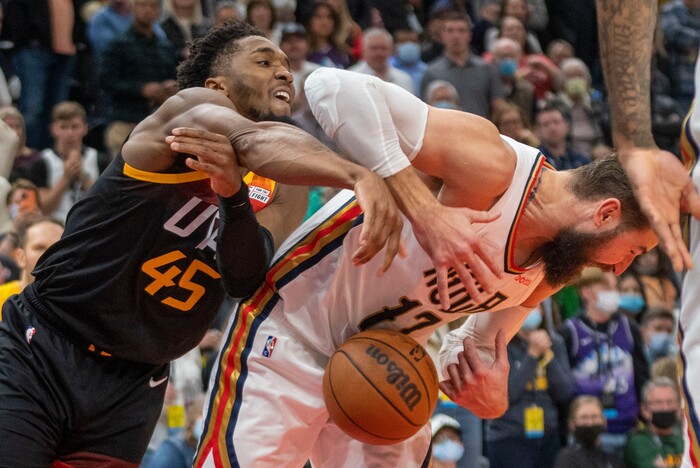 (Rick Egan | The Salt Lake Tribune) Utah Jazz guard Donovan Mitchell (45) battles New Orleans Pelicans center Jonas Valanciunas (17) for a rebound after missing his shot with just seconds left on the clock, in NBA action between the Utah Jazz and the New Orleans Pelicans, at Vivint Arena, in Salt Lake City, on Friday, Nov. 26, 2021.