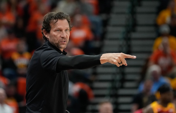 (Francisco Kjolseth | The Salt Lake Tribune) Utah Jazz head coach Quin Snyder yells out to his team during Game 3 of an NBA basketball first-round playoff series against the Dallas Mavericks, Thursday, April 21, 2022, in Salt Lake City.