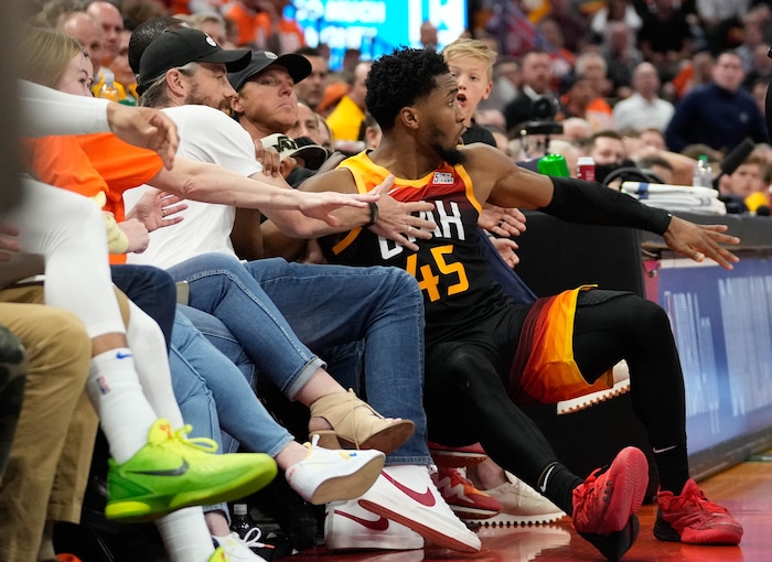 (Francisco Kjolseth | The Salt Lake Tribune) Utah Jazz guard Donovan Mitchell (45) ends up in the stands chasing down a ball during Game 3 of an NBA basketball first-round playoff series against the Dallas Mavericks, Thursday, April 21, 2022, in Salt Lake City.