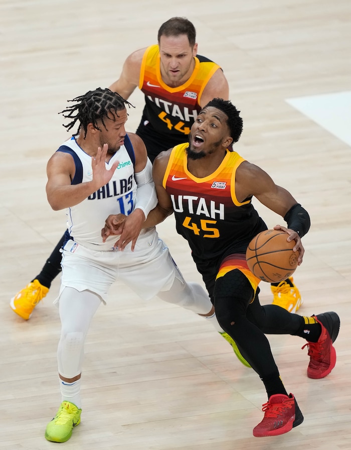 (Francisco Kjolseth | The Salt Lake Tribune) Dallas Mavericks guard Jalen Brunson (13) tries to slow down Utah Jazz guard Donovan Mitchell (45) with teammate Utah Jazz forward Bojan Bogdanovic (44) close behind during Game 3 of an NBA basketball first-round playoff series, Thursday, April 21, 2022, in Salt Lake City.
