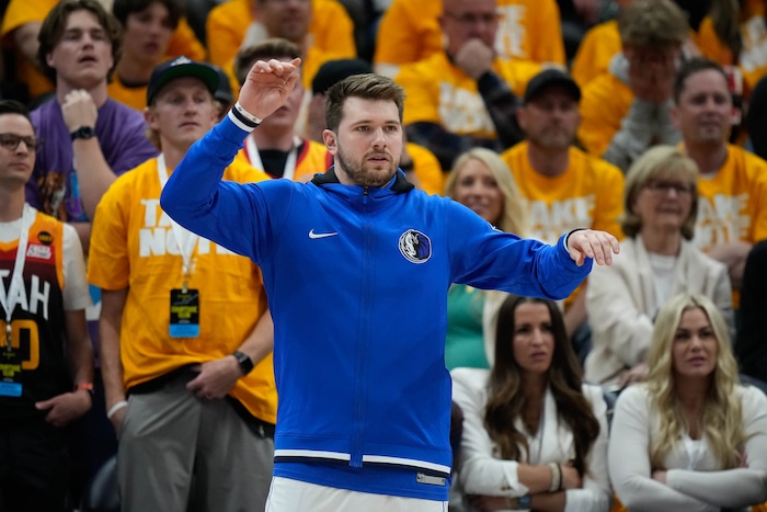 (Francisco Kjolseth | The Salt Lake Tribune) Dallas Mavericks guard Luka Doncic, right, reacts to the game against the Utah Jazz in Game 3 of an NBA basketball first-round playoff series, Thursday, April 21, 2022, in Salt Lake City. Doncic did not play in the game as he is recovering from a left calf strain.