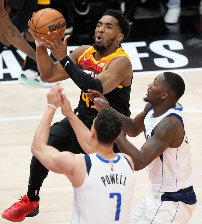 (Francisco Kjolseth | The Salt Lake Tribune) Utah Jazz guard Donovan Mitchell (45) is defended by Dallas Mavericks center Dwight Powell (7) and Dallas Mavericks forward Dorian Finney-Smith (10) during Game 3 of an NBA basketball first-round playoff series, Thursday, April 21, 2022, in Salt Lake City.