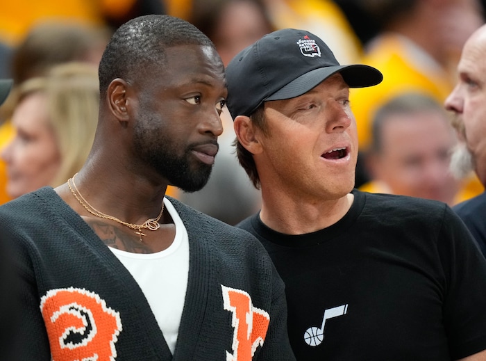 (Francisco Kjolseth | The Salt Lake Tribune) Utah Jazz owner Ryan Smith, right, is joined by business partner Dwyane Wade before the start of Game 3 of an NBA basketball first-round playoff series, Thursday, April 21, 2022, in Salt Lake City.