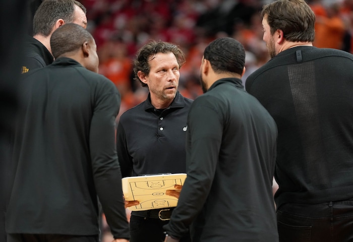(Francisco Kjolseth | The Salt Lake Tribune) Utah Jazz coach Quin Snyder confers with his coaches during Game 3 of an NBA basketball first-round playoff series against the Dallas Mavericks, Thursday, April 21, 2022, in Salt Lake City.