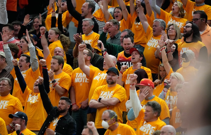 (Francisco Kjolseth | The Salt Lake Tribune) Jazz fans cheer on their team during Game 3 of an NBA basketball first-round playoff series against the Dallas Mavericks, Thursday, April 21, 2022, in Salt Lake City.