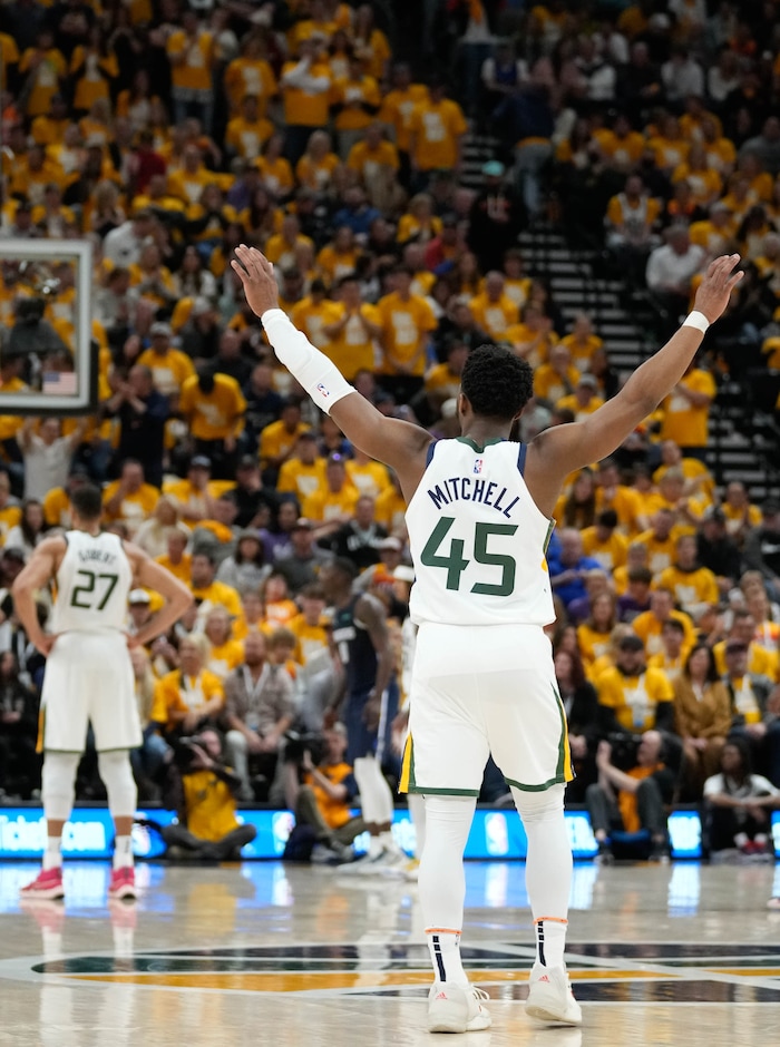 (Francisco Kjolseth | The Salt Lake Tribune) Utah Jazz guard Donovan Mitchell (45) gets the fans excited in the final seconds of their 100-99 win over the Dallas Mavericks during Game 4 of an NBA basketball first-round playoff series, Saturday, April 23, 2022, in Salt Lake City.