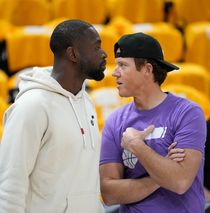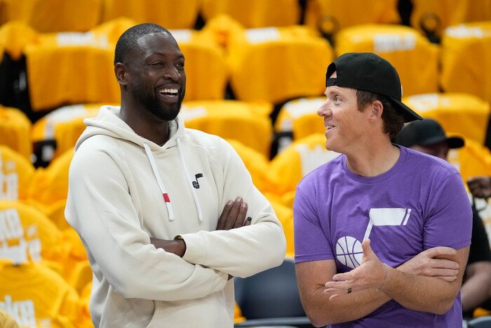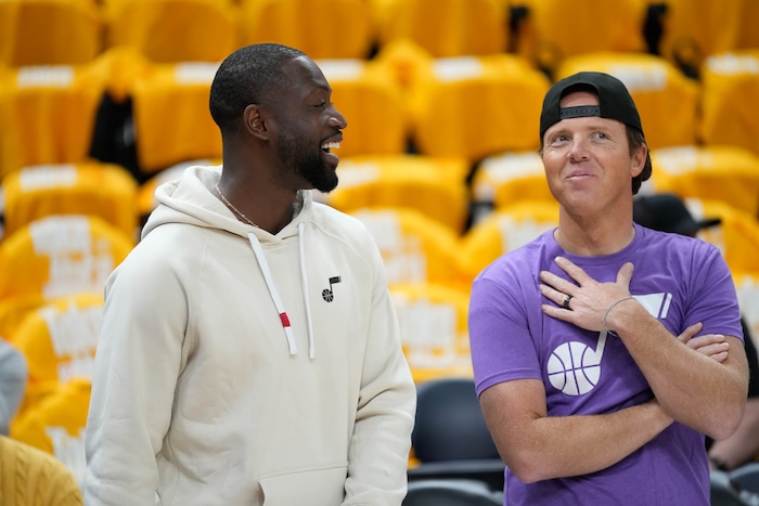 (Francisco Kjolseth | The Salt Lake Tribune) Utah Jazz minority owner Dwyane Wade, left, and Jazz owner Ryan Smith talk prior to Game 4 of an NBA basketball first-round playoff series against the Dallas Mavericks, Saturday, April 23, 2022, in Salt Lake City.