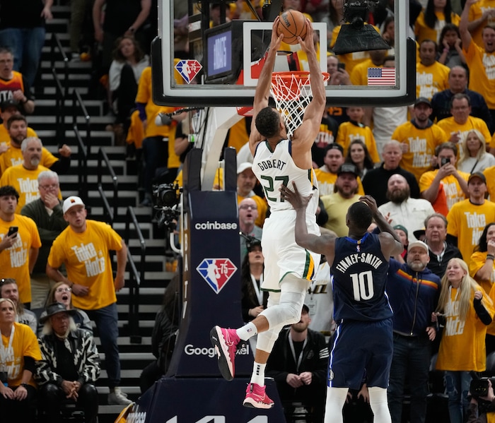 (Francisco Kjolseth | The Salt Lake Tribune) Utah Jazz center Rudy Gobert (27) scores a critical basket with 11-seconds left on the clock to bring home the win 100-99 over Dallas during Game 4 of an NBA basketball first-round playoff series, Saturday, April 23, 2022, in Salt Lake City.