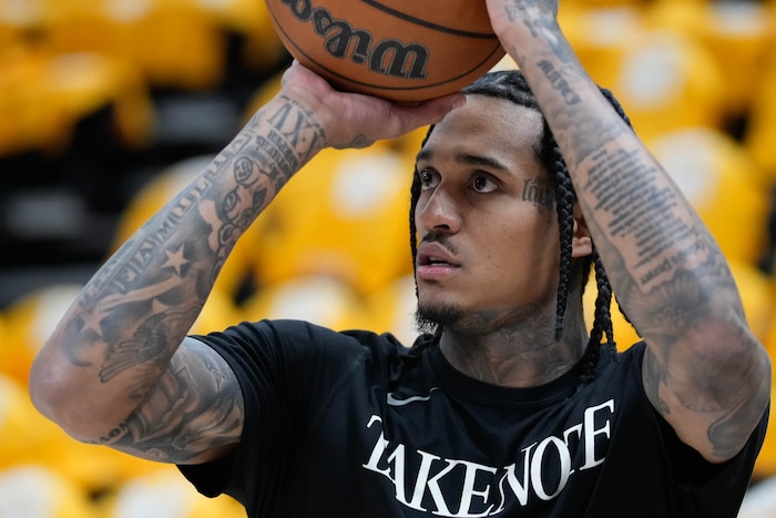 (Francisco Kjolseth | The Salt Lake Tribune) Utah Jazz guard Jordan Clarkson (00) warms up prior to Game 4 of an NBA basketball first-round playoff series against the Dallas Mavericks, Saturday, April 23, 2022, in Salt Lake City.