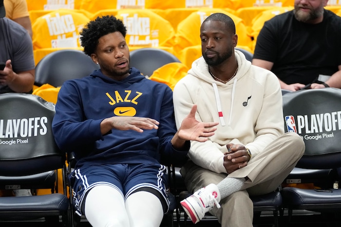 (Francisco Kjolseth | The Salt Lake Tribune) Utah Jazz forward Rudy Gay (8) talks with Utah Jazz minority owner Dwyane Wade prior to Game 4 of an NBA basketball first-round playoff series against the Dallas Mavericks, Saturday, April 23, 2022, in Salt Lake City.
