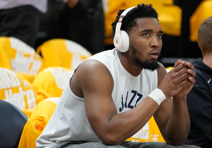 (Francisco Kjolseth | The Salt Lake Tribune) Utah Jazz guard Donovan Mitchell (45) listens to music as he begins his warm up routine prior to Game 4 of an NBA basketball first-round playoff series against the Dallas Mavericks, Saturday, April 23, 2022, in Salt Lake City.