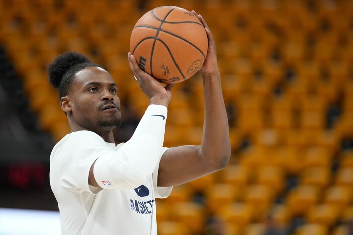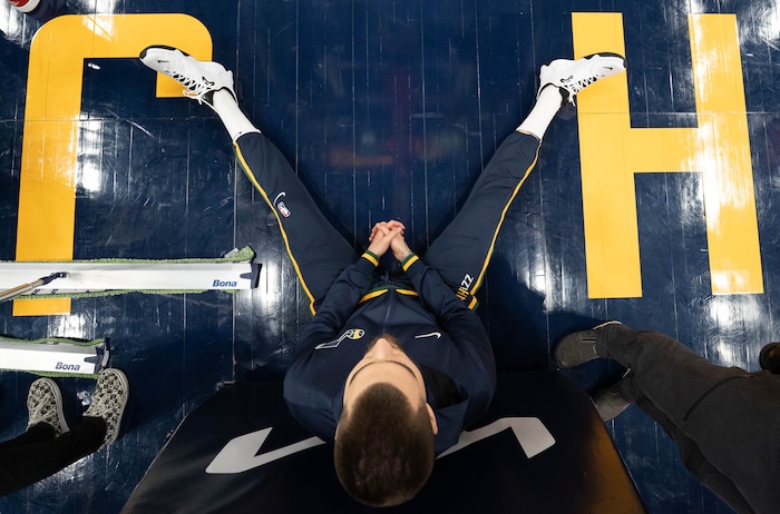 (Francisco Kjolseth | The Salt Lake Tribune) Utah Jazz forward Juancho Hernangomez (41) goes through his pre-game routine before Game 4 of an NBA basketball first-round playoff series, Saturday, April 23, 2022, in Salt Lake City against the Dallas Mavericks.