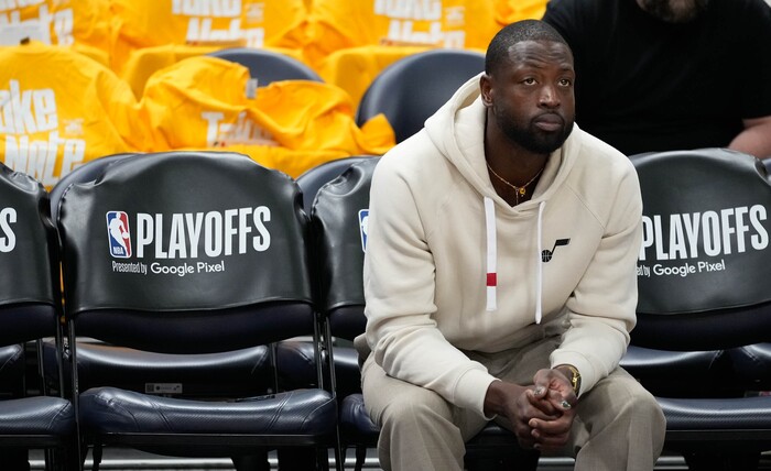 (Francisco Kjolseth | The Salt Lake Tribune) Utah Jazz minority owner Dwyane Wade watches the team warm up prior to Game 4 of an NBA basketball first-round playoff series, Saturday, April 23, 2022, in Salt Lake City.