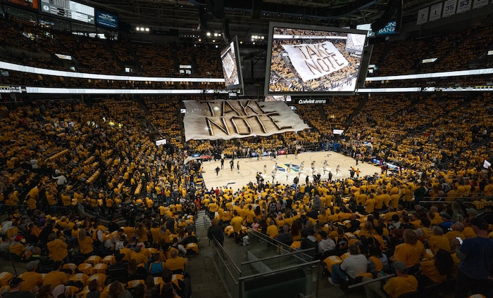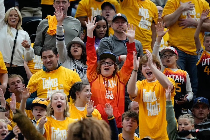 (Francisco Kjolseth | The Salt Lake Tribune) The fans get ready for Game 4 of an NBA basketball first-round playoff series, Saturday, April 23, 2022, in Salt Lake City.