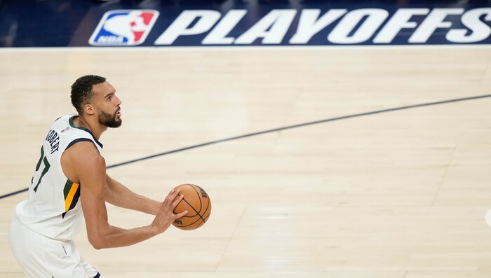 (Francisco Kjolseth | The Salt Lake Tribune) Utah Jazz center Rudy Gobert (27) eyes his free throw during Game 4 of an NBA basketball first-round playoff series, Saturday, April 23, 2022, in Salt Lake City.