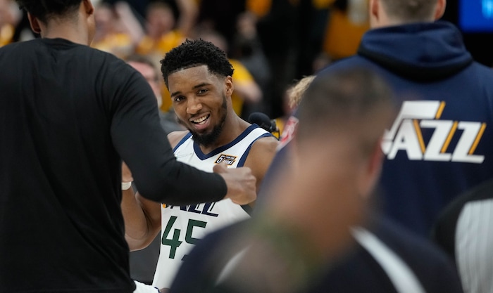 (Francisco Kjolseth | The Salt Lake Tribune) Utah Jazz guard Donovan Mitchell (45) celebrates their team win 100-99 over Dallas during Game 4 of an NBA basketball first-round playoff series, Saturday, April 23, 2022, in Salt Lake City.