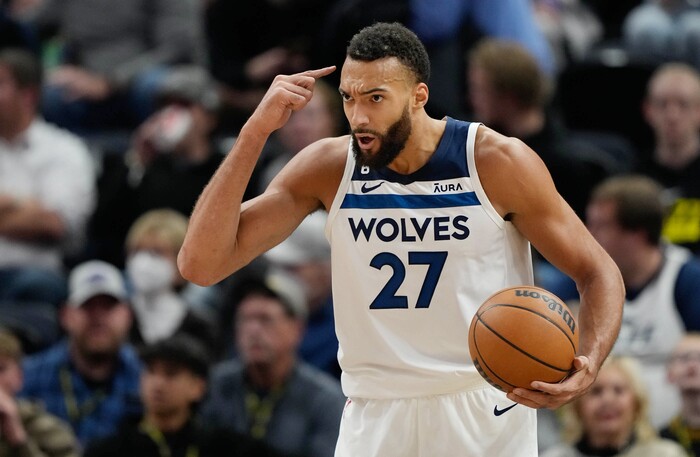 (Francisco Kjolseth | The Salt Lake Tribune) Minnesota Timberwolves center Rudy Gobert (27) motions to his teammates as the Utah Jazz take on Minnesota Timberwolves in NBA basketball at Vivint Arena in Salt Lake City on Friday, Dec. 9, 2022.