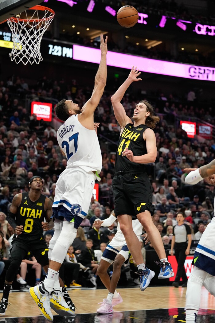 (Francisco Kjolseth | The Salt Lake Tribune) Minnesota Timberwolves center Rudy Gobert (27) tries to block Utah Jazz forward Kelly Olynyk (41) as the Utah Jazz take on Minnesota Timberwolves in NBA basketball at Vivint Arena in Salt Lake City on Friday, Dec. 9, 2022.