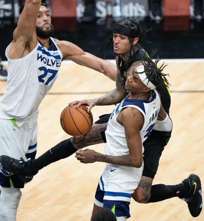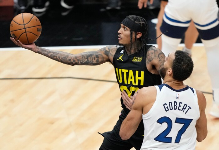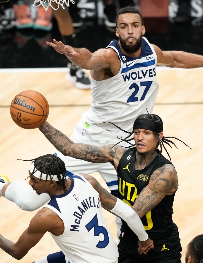 (Francisco Kjolseth | The Salt Lake Tribune) Utah Jazz guard Jordan Clarkson (00) moves past Minnesota Timberwolves center Rudy Gobert (27) and Minnesota Timberwolves forward Jaden McDaniels (3) as the Utah Jazz take on Minnesota Timberwolves in NBA basketball at Vivint Arena in Salt Lake City on Friday, Dec. 9, 2022.
