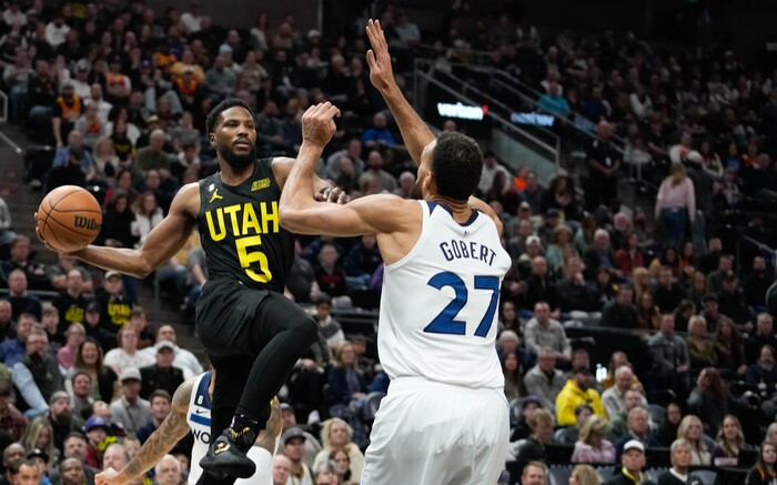 (Francisco Kjolseth | The Salt Lake Tribune) Utah Jazz guard Malik Beasley (5) looks for an open teammates while Minnesota Timberwolves center Rudy Gobert (27) as the Utah Jazz take on Minnesota Timberwolves in NBA basketball at Vivint Arena in Salt Lake City on Friday, Dec. 9, 2022.