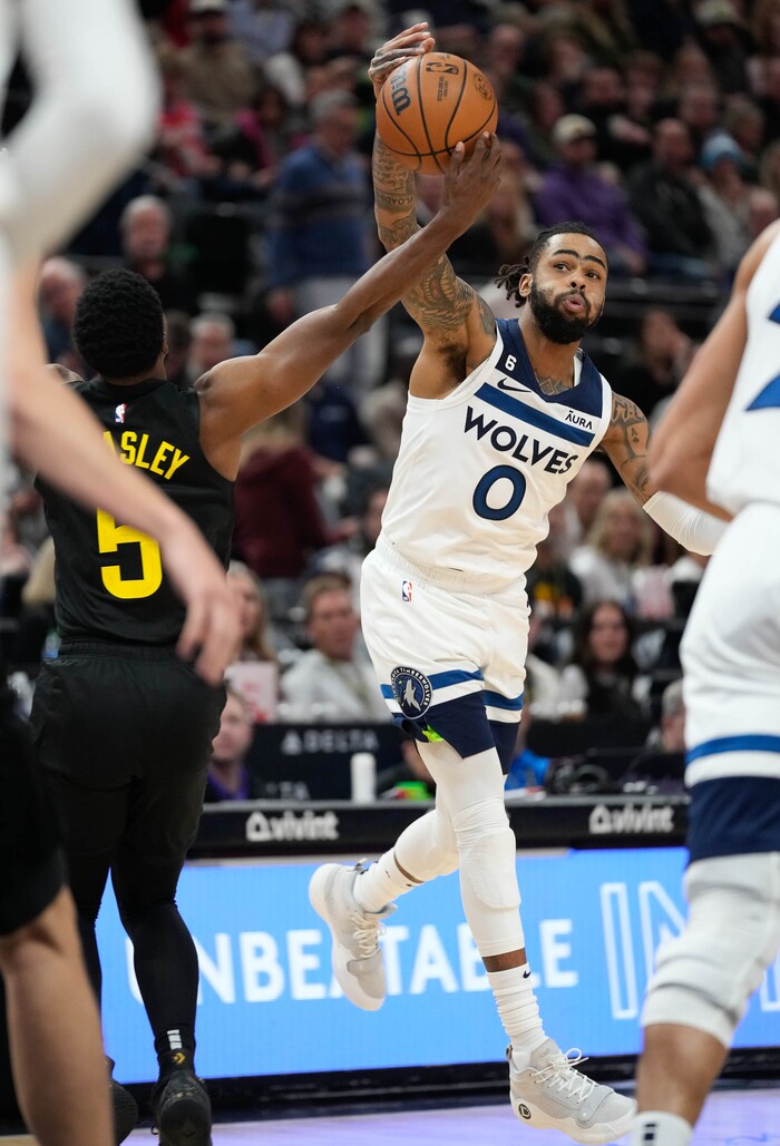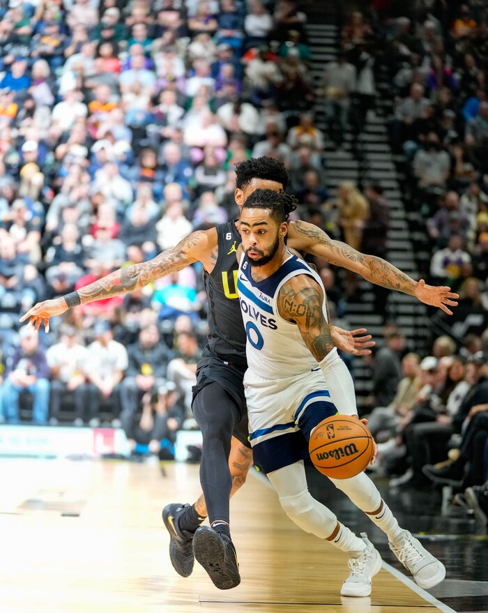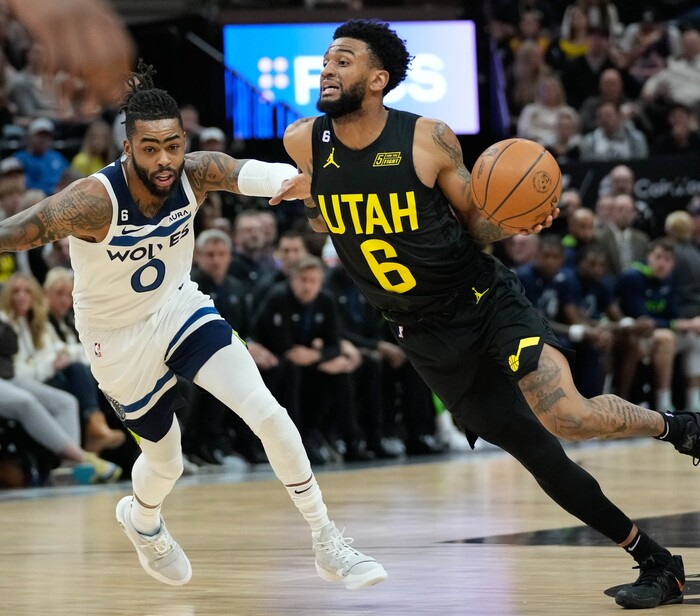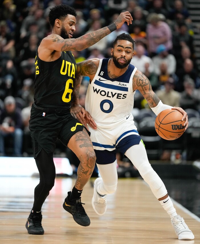 (Francisco Kjolseth | The Salt Lake Tribune) Utah Jazz guard Nickeil Alexander-Walker (6) moves past Minnesota Timberwolves guard D'Angelo Russell (0) as the Utah Jazz take on Minnesota Timberwolves in NBA basketball at Vivint Arena in Salt Lake City on Friday, Dec. 9, 2022.