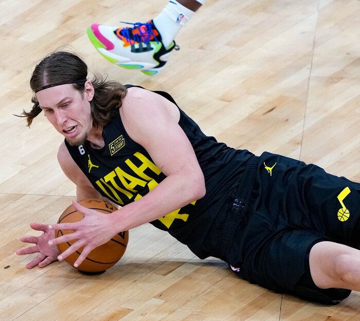 (Francisco Kjolseth | The Salt Lake Tribune) Utah Jazz forward Kelly Olynyk (41) hits the floor as the Utah Jazz take on Minnesota Timberwolves in NBA basketball at Vivint Arena in Salt Lake City on Friday, Dec. 9, 2022.