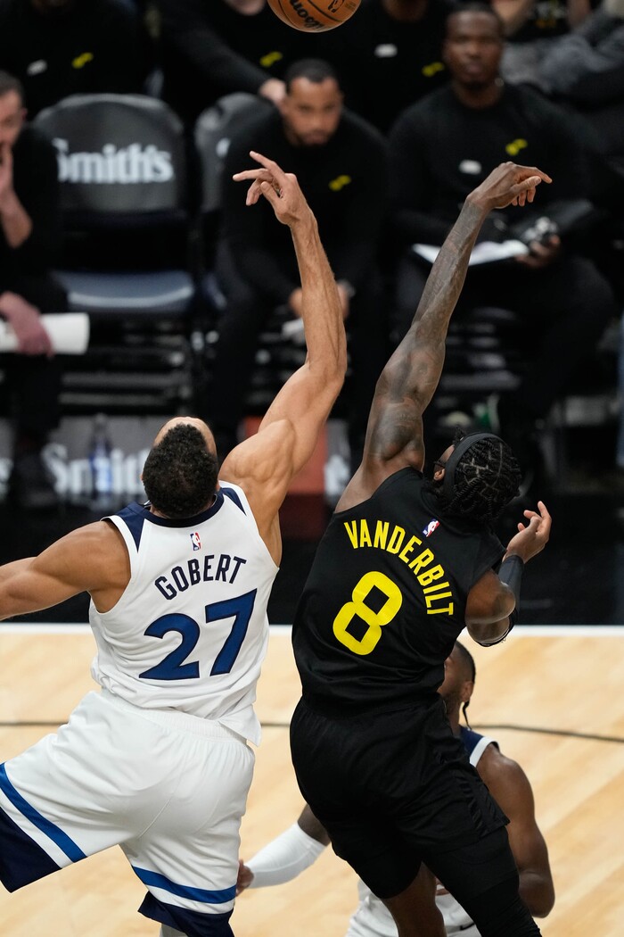 (Francisco Kjolseth | The Salt Lake Tribune) Minnesota Timberwolves center Rudy Gobert (27) challenges Utah Jazz forward Jarred Vanderbilt (8) for a rebound as the Utah Jazz take on Minnesota Timberwolves in NBA basketball at Vivint Arena in Salt Lake City on Friday, Dec. 9, 2022.