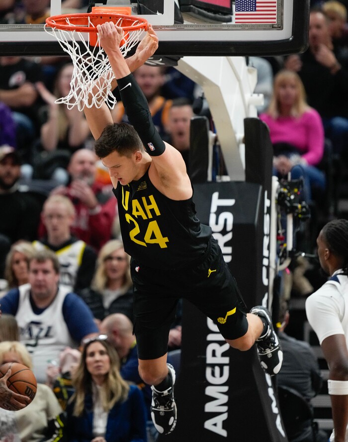 (Francisco Kjolseth | The Salt Lake Tribune) Utah Jazz center Walker Kessler (24) hangs off the rim on a dunk as the Utah Jazz take on Minnesota Timberwolves in NBA basketball at Vivint Arena in Salt Lake City on Friday, Dec. 9, 2022.