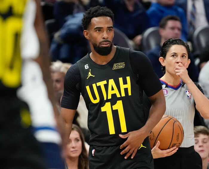 (Francisco Kjolseth | The Salt Lake Tribune) Utah Jazz guard Mike Conley (11) returns from injury as the Utah Jazz take on Minnesota Timberwolves in NBA basketball at Vivint Arena in Salt Lake City on Friday, Dec. 9, 2022.