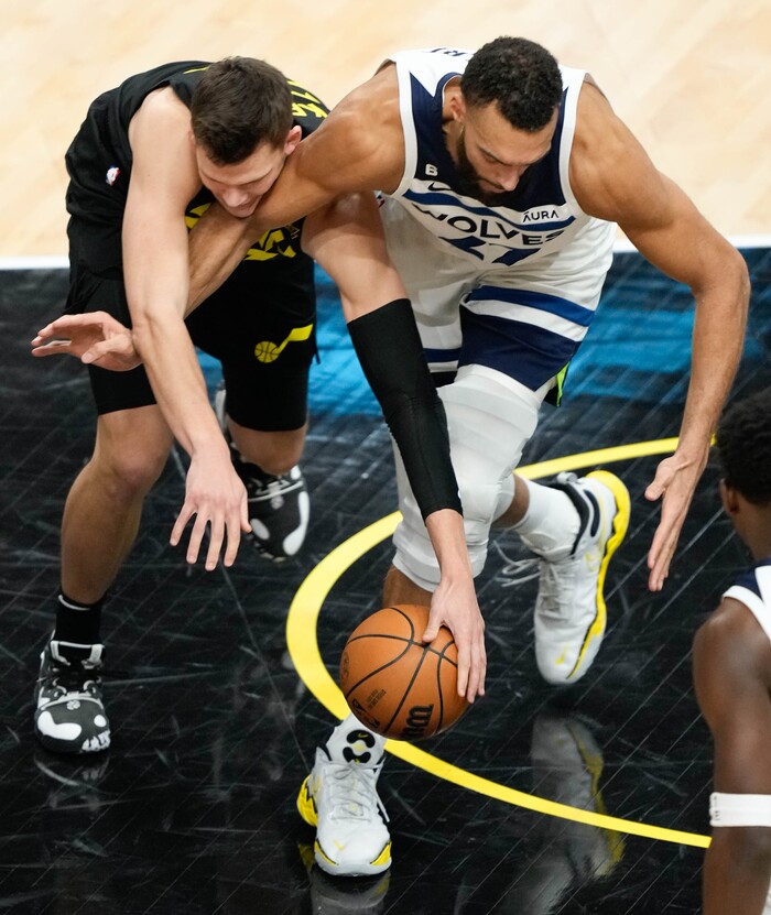 (Francisco Kjolseth | The Salt Lake Tribune) Minnesota Timberwolves center Rudy Gobert (27) and Utah Jazz guard Jordan Clarkson (00) chase down a loose ball as the Utah Jazz take on Minnesota Timberwolves in NBA basketball at Vivint Arena in Salt Lake City on Friday, Dec. 9, 2022.