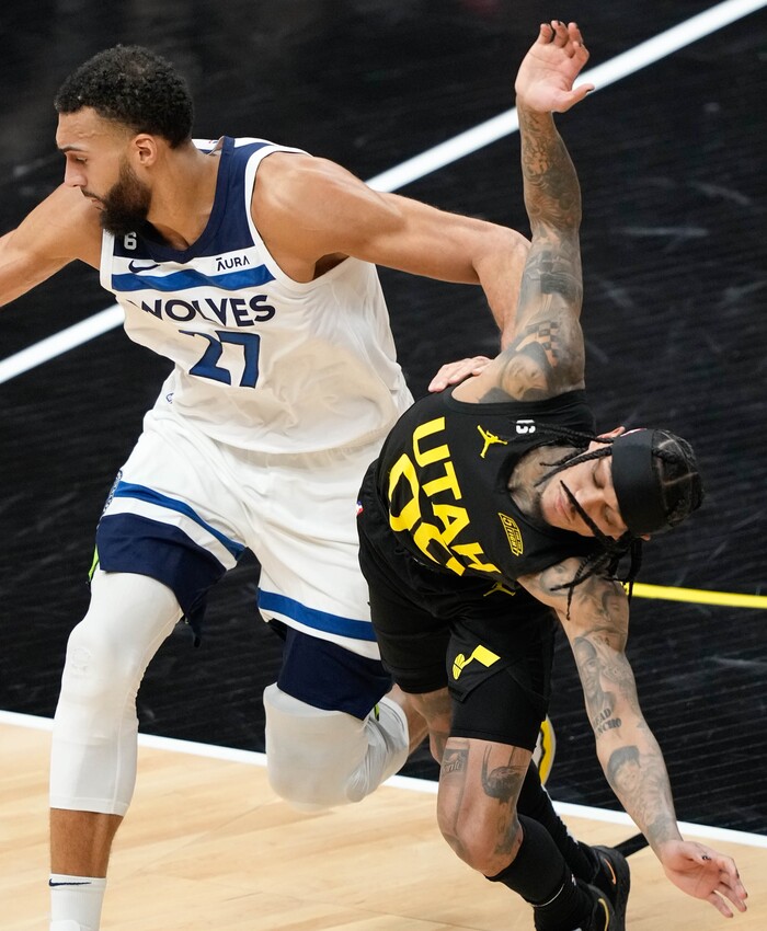 (Francisco Kjolseth | The Salt Lake Tribune) Minnesota Timberwolves center Rudy Gobert (27) collides with Utah Jazz guard Jordan Clarkson (00) as the Utah Jazz take on Minnesota Timberwolves in NBA basketball at Vivint Arena in Salt Lake City on Friday, Dec. 9, 2022.