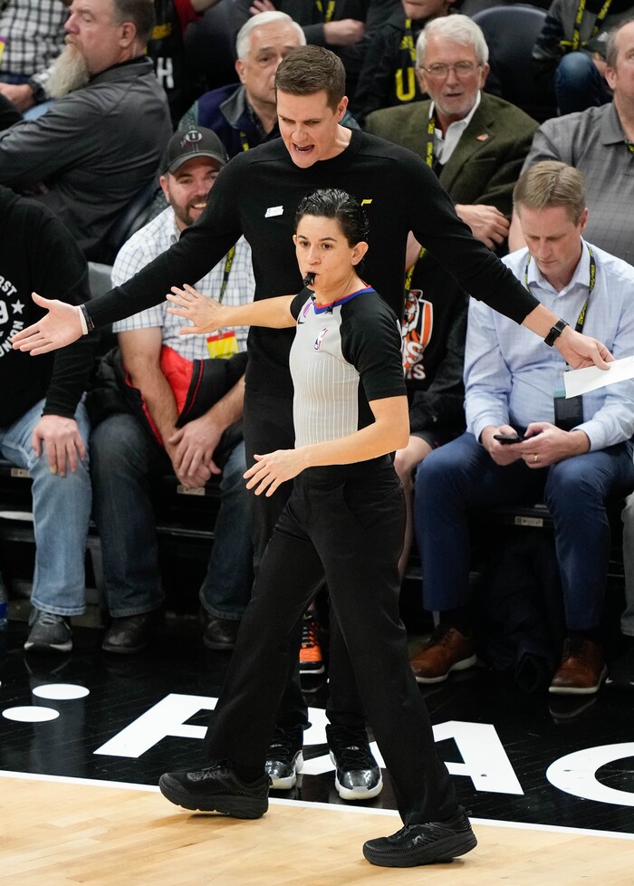 (Francisco Kjolseth | The Salt Lake Tribune) Utah Jazz coach Will Hardy argues with referee Cheryl Flores (91) as the Utah Jazz take on Minnesota Timberwolves in NBA basketball at Vivint Arena in Salt Lake City on Friday, Dec. 9, 2022.