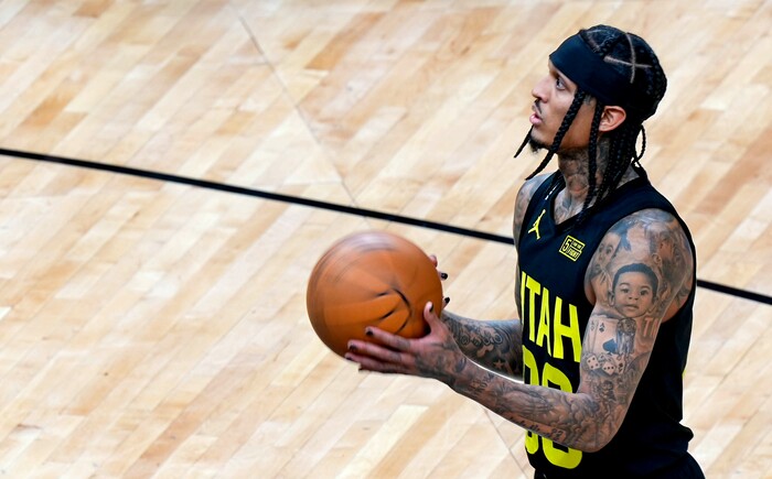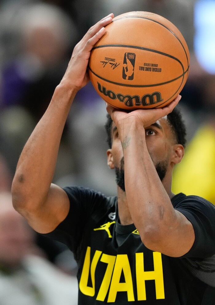 (Francisco Kjolseth | The Salt Lake Tribune) Utah Jazz guard Jordan Clarkson (00) spins the ball as he readies for a free throw as the Utah Jazz take on Minnesota Timberwolves in NBA basketball at Vivint Arena in Salt Lake City on Friday, Dec. 9, 2022.